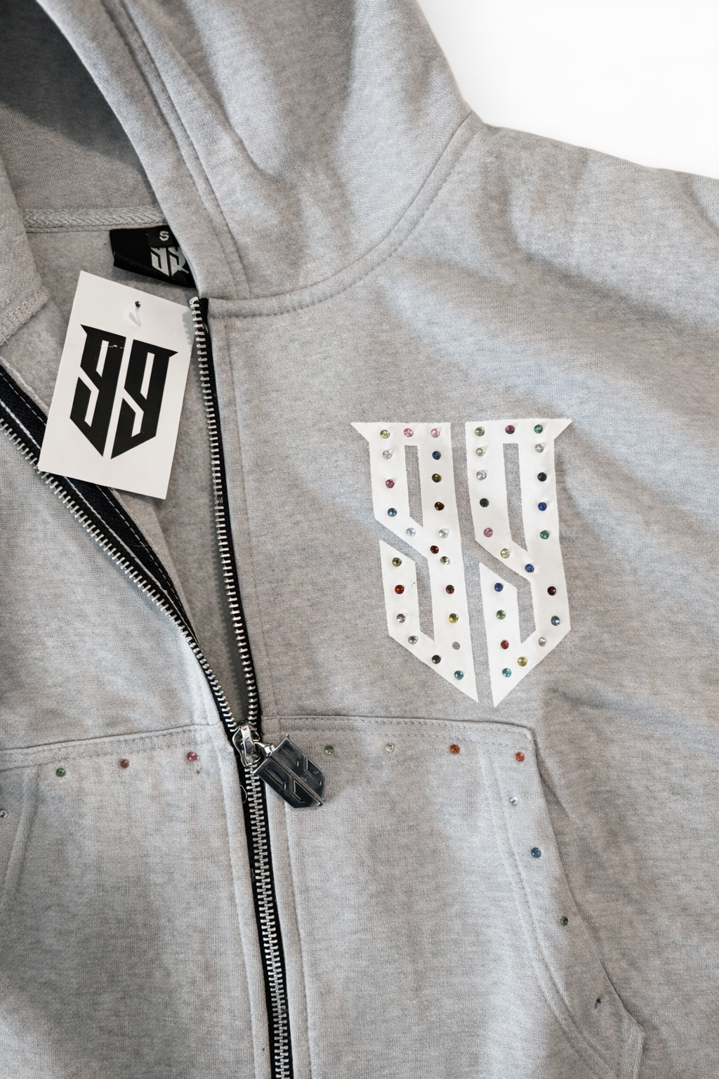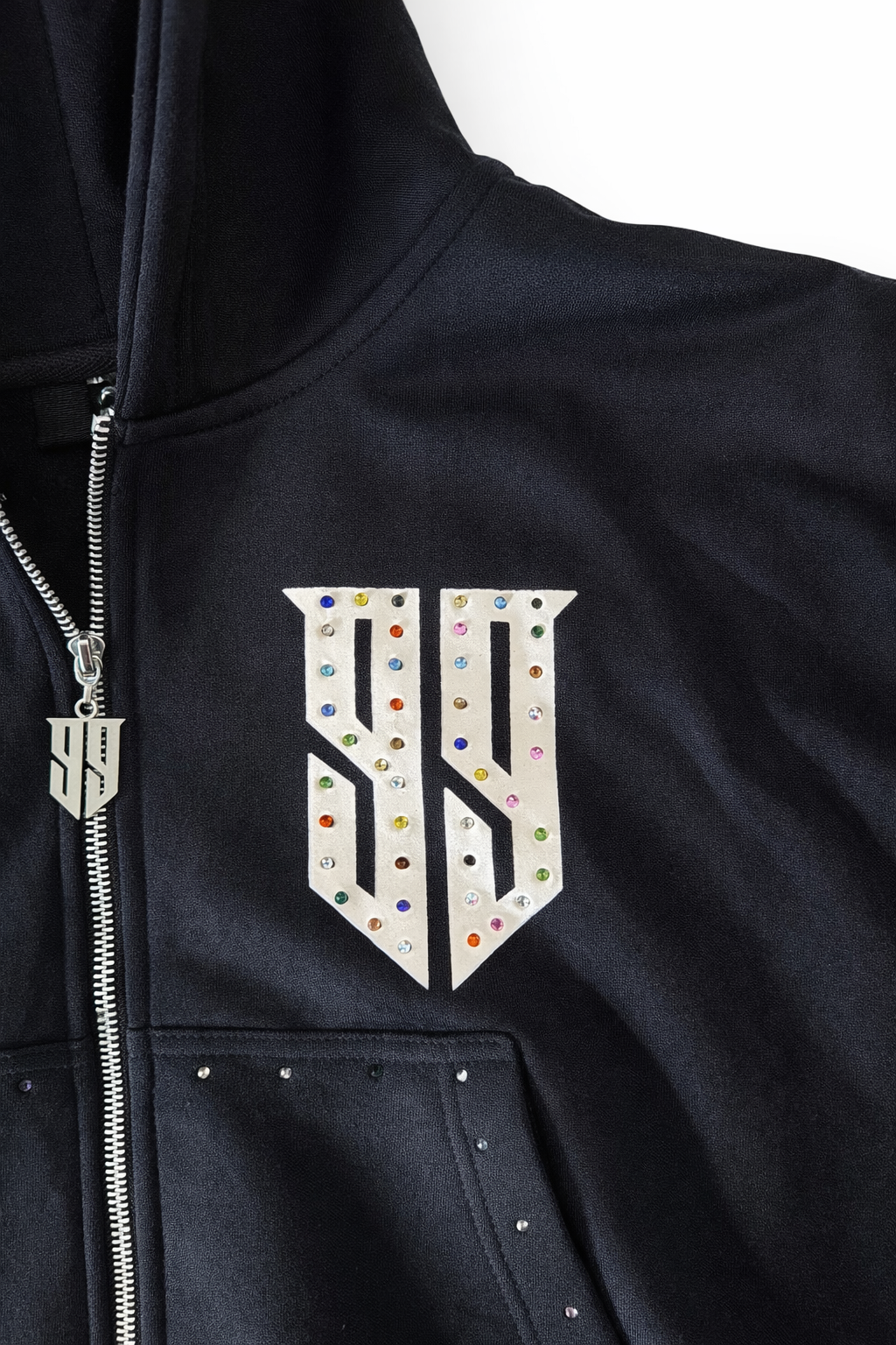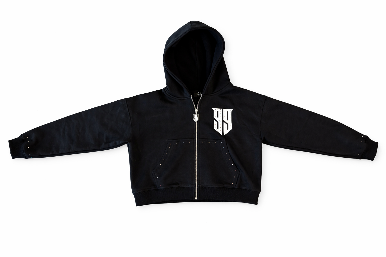 - Hand-placed rhinestones along pant legs & hoodie pockets