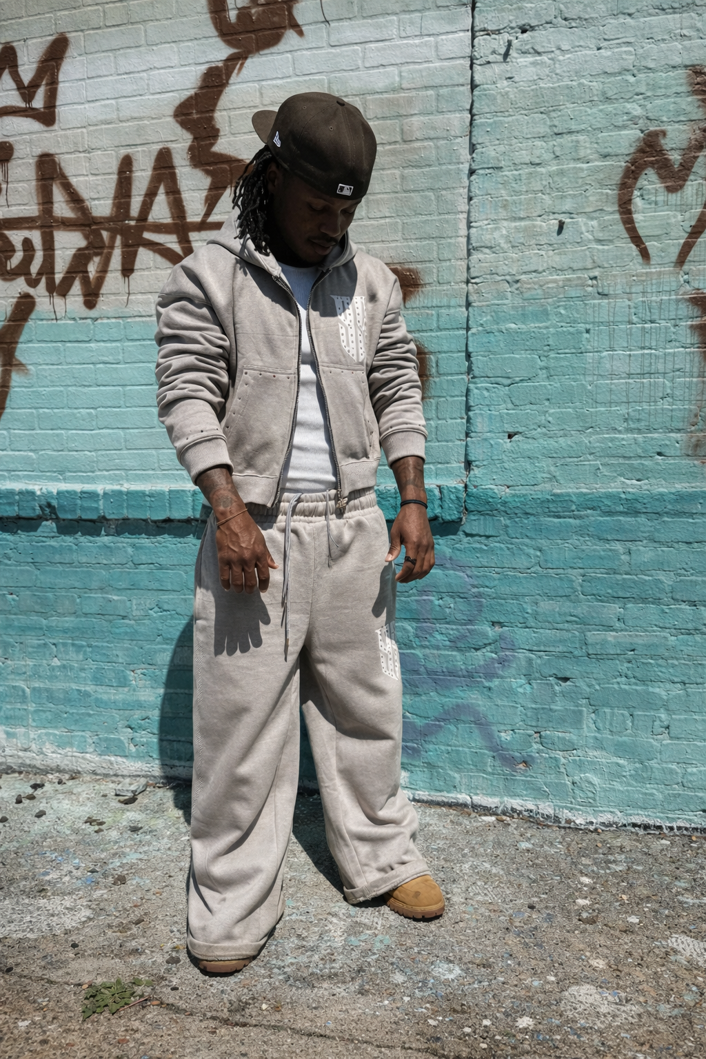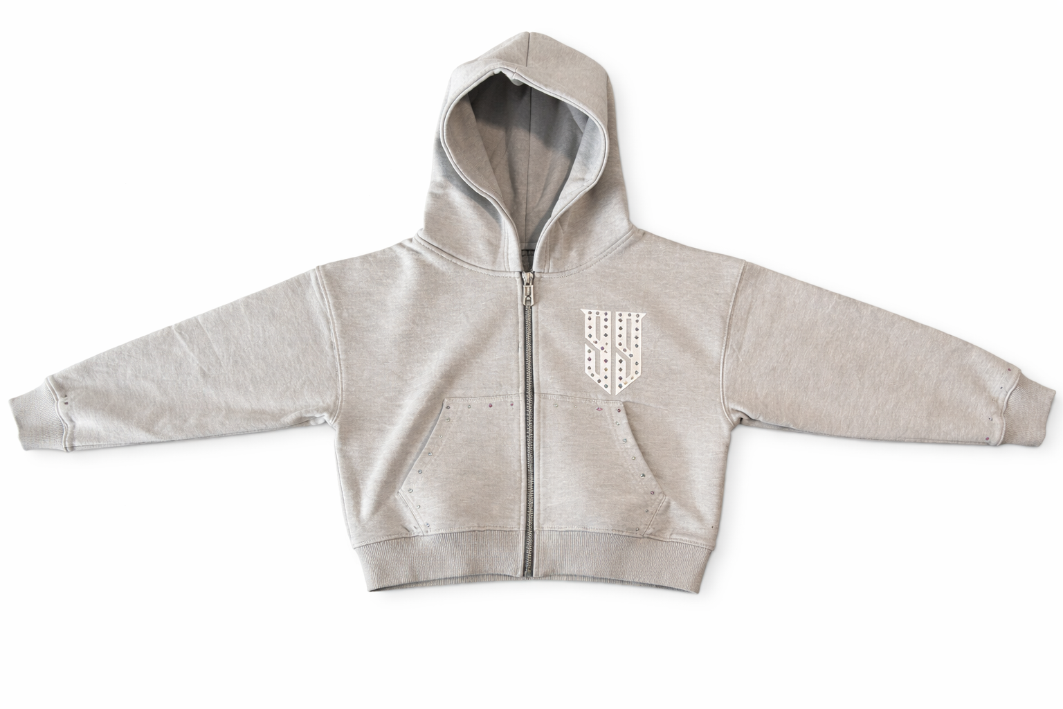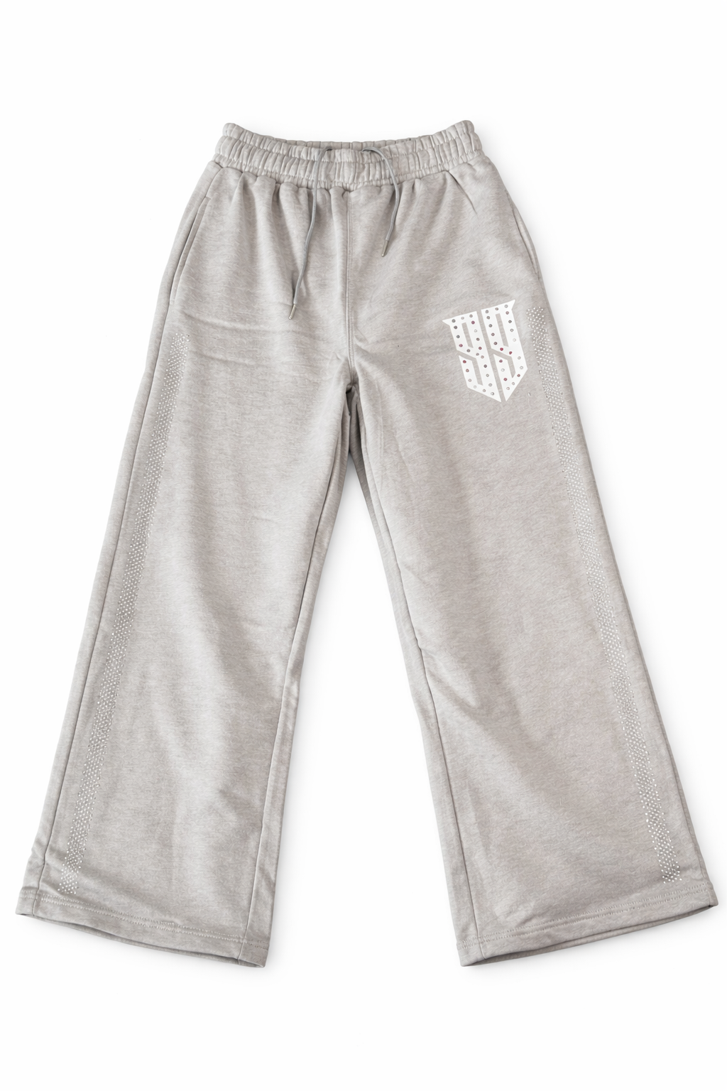 - Hand-placed rhinestones along pant legs & hoodie pockets